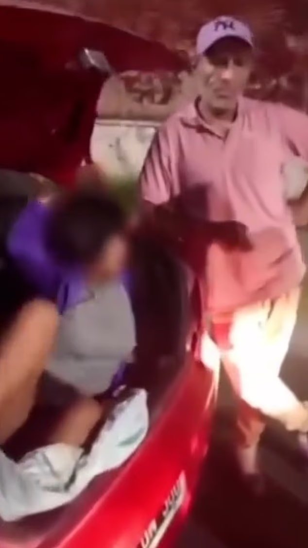 Nas imagens da cena surreal, um policial perguntou ao homem: ‘Quem é aquele aí dentro? enquanto ele espiava dentro do porta-malas do carro vermelho. O taxista respondeu: ‘É minha esposa.’