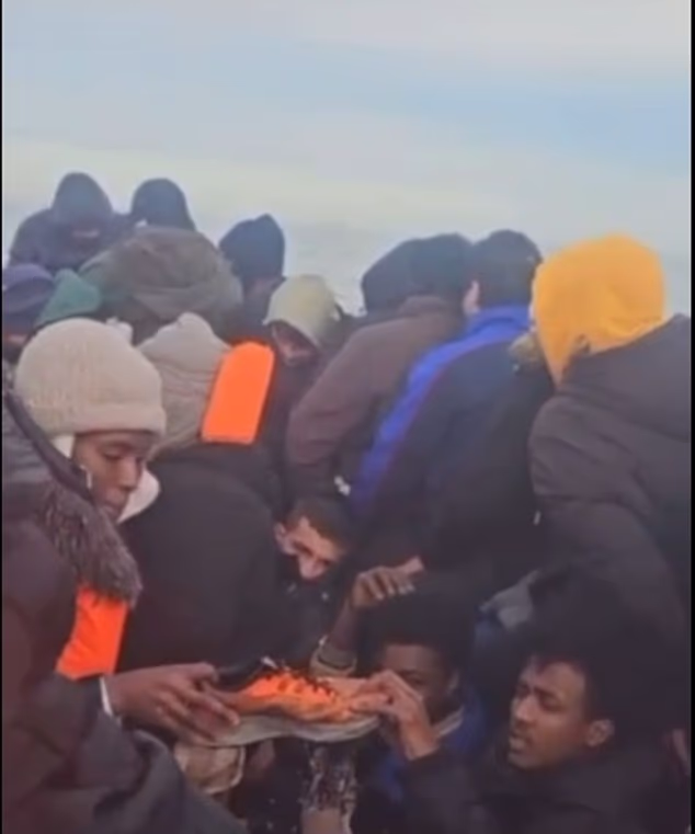 Imagens chocantes tiradas a bordo de um pequeno barco que atravessava o Canal da Mancha mostram-no a afundar-se com migrantes que usavam ténis de marca Nike para remover desesperadamente a água.