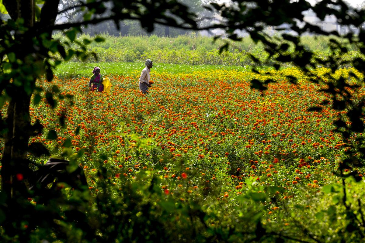 Colheita dourada: Os agricultores colhem campos de calêndula cultivados para o competition Bathukamma, nos arredores de Hyderabad.