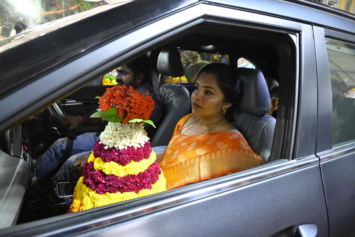 Em movimento: uma mulher transporta seu Bathukamma intrincadamente organizado em um carro pelas ruas de Kukatpally.