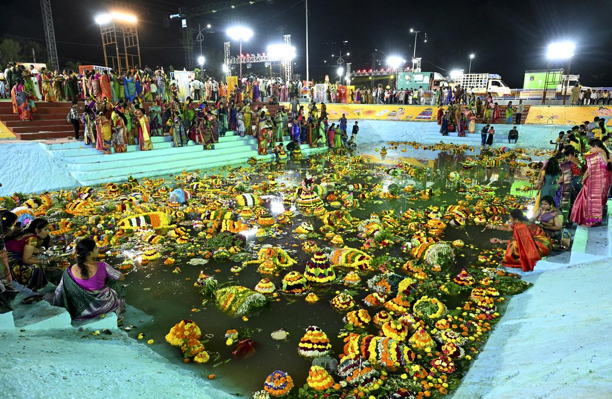 Pétalas de despedida: As mulheres trazem seus Bathukammas para o Lago Kukatpally em Hyderabad para imersão, marcando o encerramento do competition.