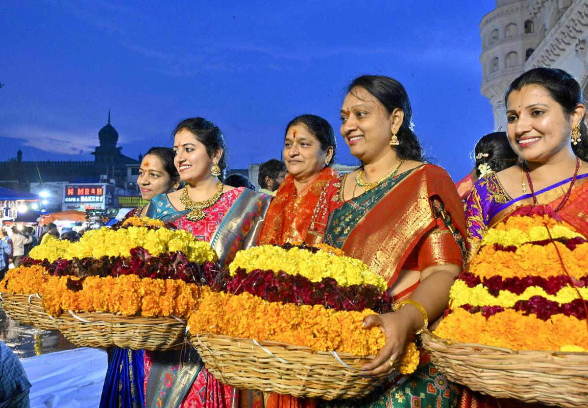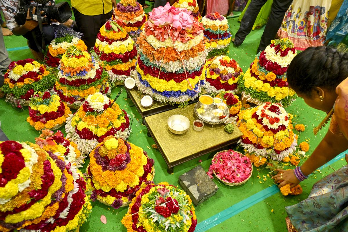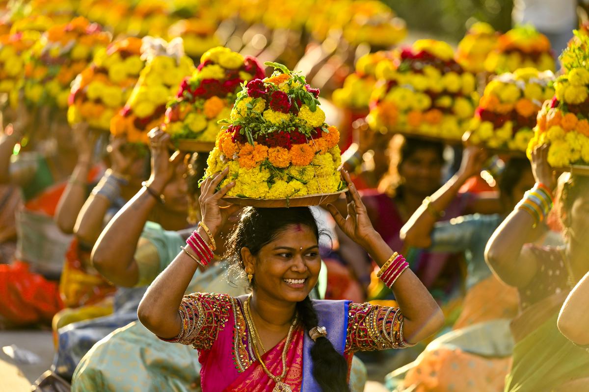 Flores vibrantes: Bathukammas feitas de camadas de flores são colocadas no chão enquanto as mulheres executam danças tradicionais e cantam canções festivas.