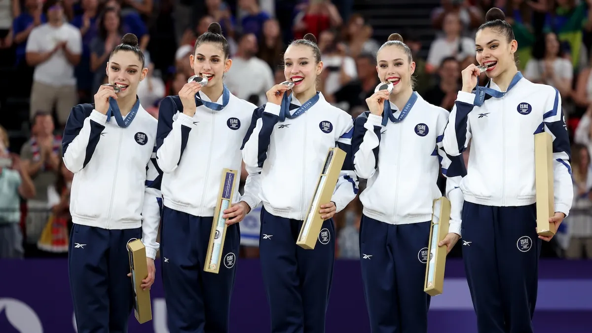 Os medalhistas de prata da equipe de Israel comemoram no pódio durante a cerimônia de medalhas da last geral do grupo de ginástica rítmica no décimo quinto dia dos Jogos Olímpicos de Paris 2024 na Area Porte de La Chapelle em Paris, França, em 10 de agosto de 2024. (Jamie Squire/Imagens Getty)