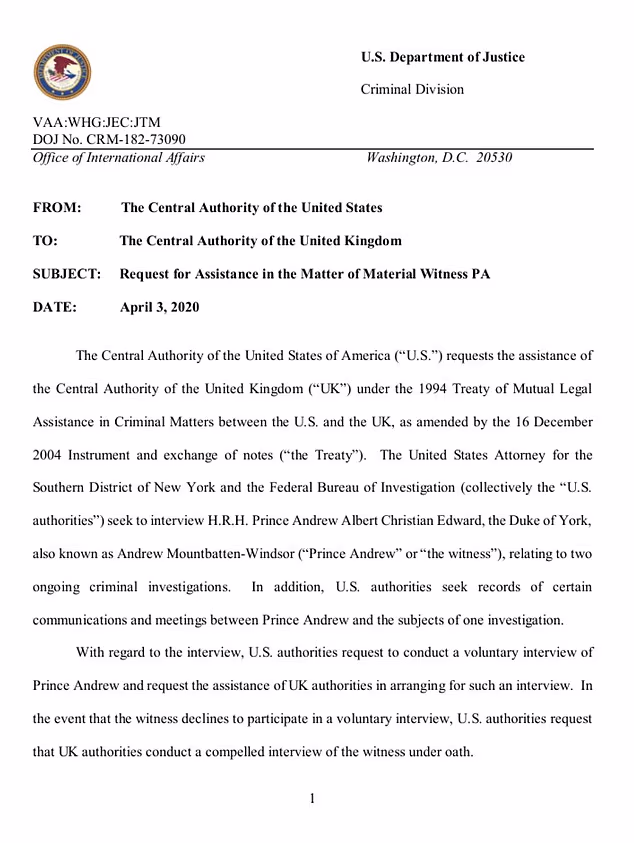 No caso de Andrew se recusar a ser entrevistado voluntariamente, a carta diz: ‘As autoridades dos EUA solicitam que as autoridades do Reino Unido conduzam uma entrevista forçada da testemunha sob juramento.’