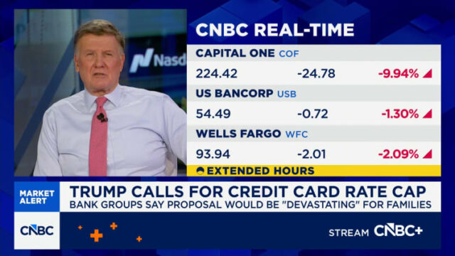 A medida enviou ações de grandes bancos, incluindo Grupo Citi, JPMorgan Chase, Wells Fargo e Banco da América caiu entre 1% e 3% na segunda-feira. Empresas mais fortemente ligadas à indústria de cartões, como Visa, MasterCard e American Specifictambém caiu. Capital Umcuja carteira de empréstimos provém principalmente de cartões de crédito, caiu quase 7%.
