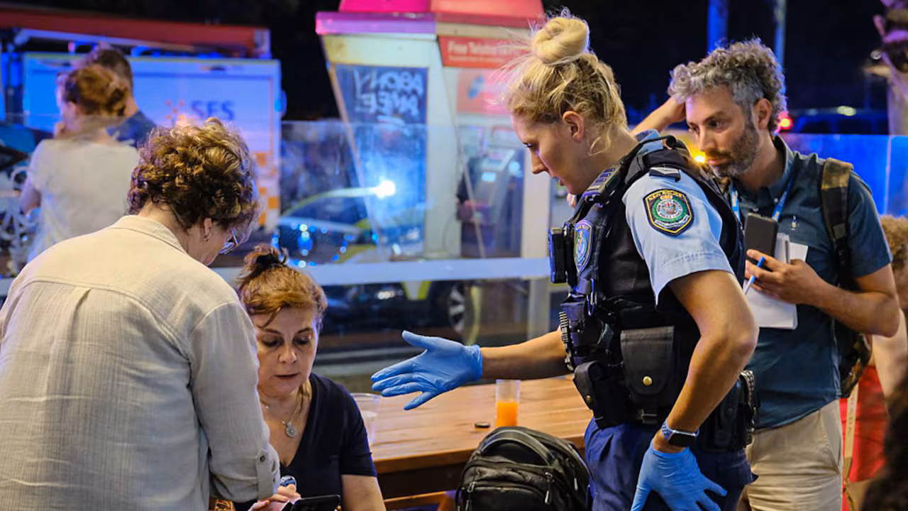 Imagens de Bondi Seaside mostram a polícia cercando dois homens caídos no chão em uma passarela de pedestres, enquanto o público tinha que ser puxado de um dos homens.