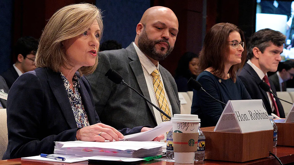 A deputada estadual de Minnesota Kristin Robbins, à esquerda, faz uma declaração de abertura enquanto testemunha ao lado, da esquerda para a direita, dos deputados estaduais de Minnesota Walter Hudson e Marion Rarick e do ex-assessor especial do Departamento de Justiça Brendan Ballou durante uma audiência perante o Comitê de Supervisão da Câmara e Reforma do Governo sobre o escândalo de fraude em Minnesota. (Chip Somodevilla/Getty Photos)