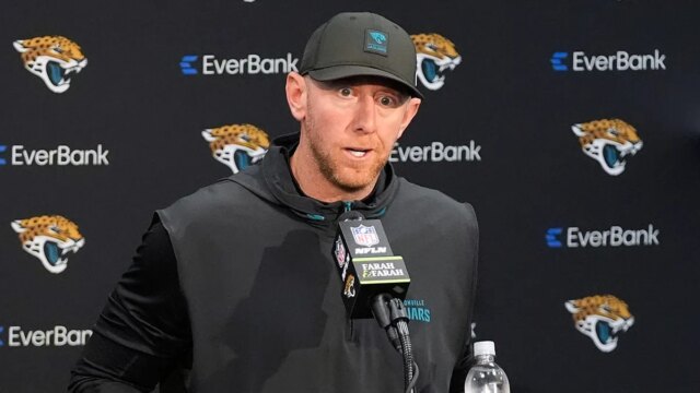 O técnico do Jacksonville Jaguars, Liam Coen, fala aos repórteres após um jogo de playoff de futebol americano da NFL contra o Buffalo Payments no domingo, 11 de janeiro de 2026, em Jacksonville, Flórida. (Foto AP/John Raoux)