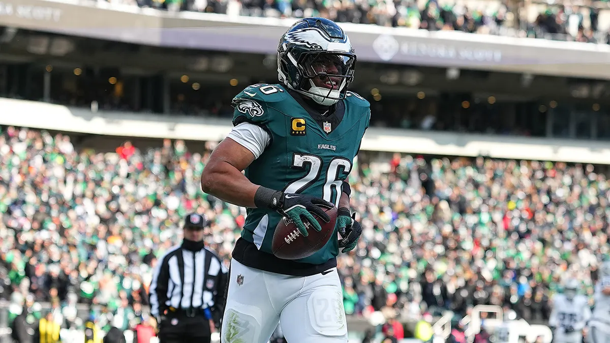 Saquon Barkley, do Philadelphia Eagles, comemora depois de marcar um landing durante o segundo quarto contra o Las Vegas Raiders no Lincoln Monetary Area em 14 de dezembro de 2025 na Filadélfia, Pensilvânia. (Mitchell Leff/Imagens Getty)