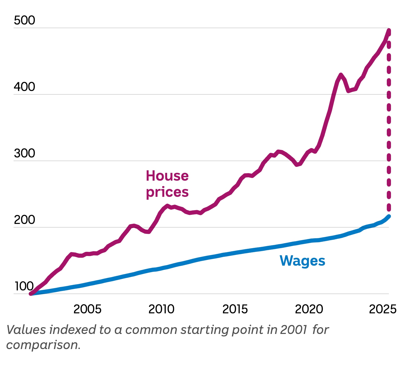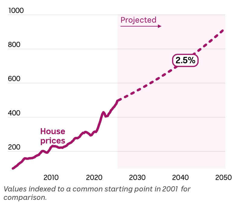 Suponha que definamos que os preços das casas cresçam em 2,5 por cento por ano, o mesmo nível que a meta do Reserve Financial institution para todos os preços.
