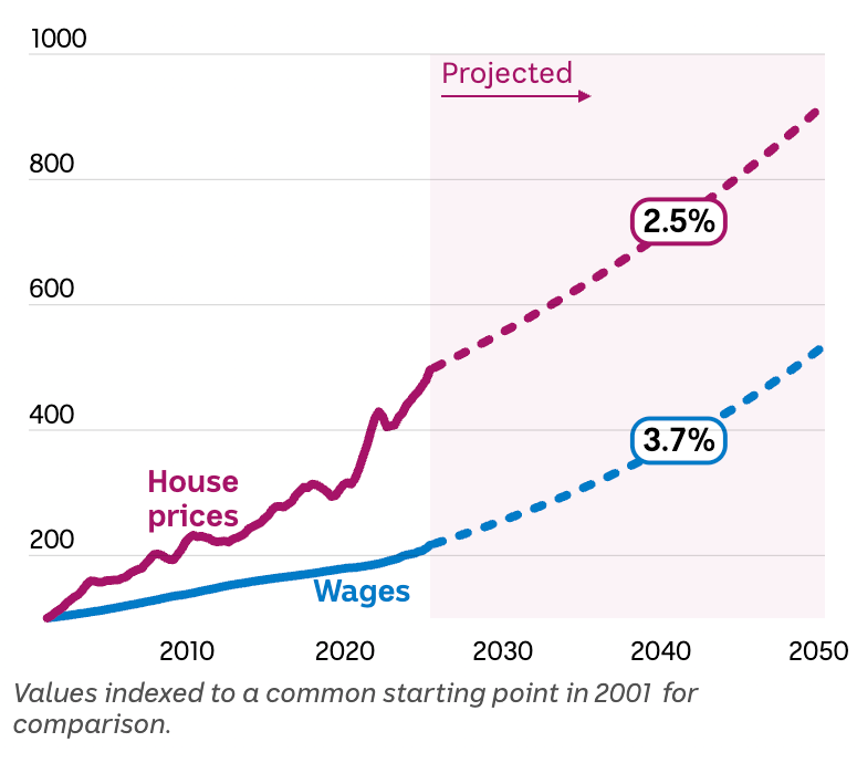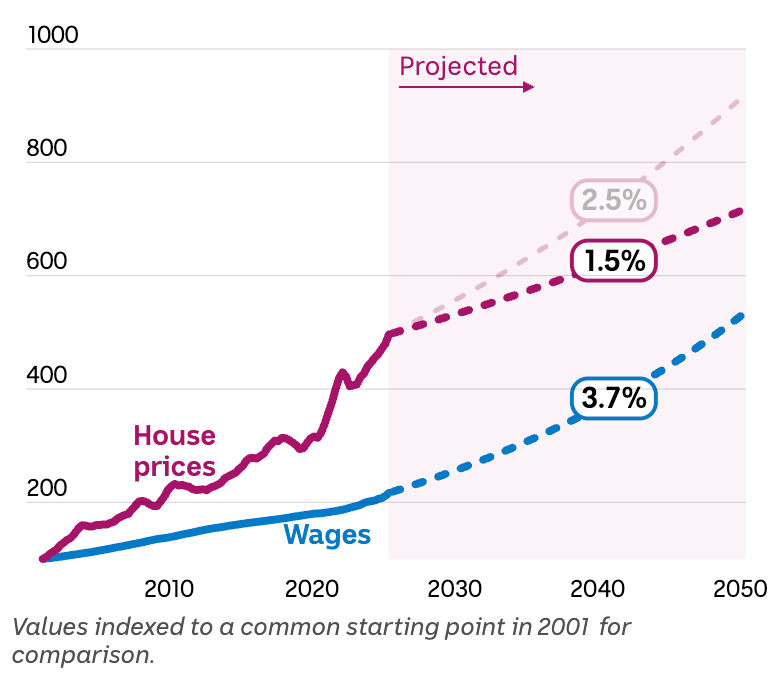 Os governos não estabelecem metas para os preços das casas e, mesmo que quisessem, é improvável que o conseguissem. Os preços são moldados pelas taxas de juro, pelos níveis de migração, pela oferta de habitação e pelas condições económicas mais amplas que nenhum governo preveria com confiança neste horizonte temporal.