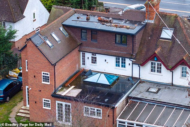 Uma visão aérea dos fundos da casa de Hussain em Berkshire. Obras continuam inacabadas, com remendos em parte do telhado