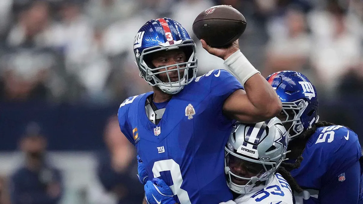 Russell Wilson, do New York Giants, tenta escapar de um sack do lado defensivo do Dallas Cowboys, James Houston (53), no primeiro tempo de um jogo de futebol americano da NFL no domingo, 14 de setembro de 2025, em Arlington, Texas. (Julio Cortez/AP Picture)