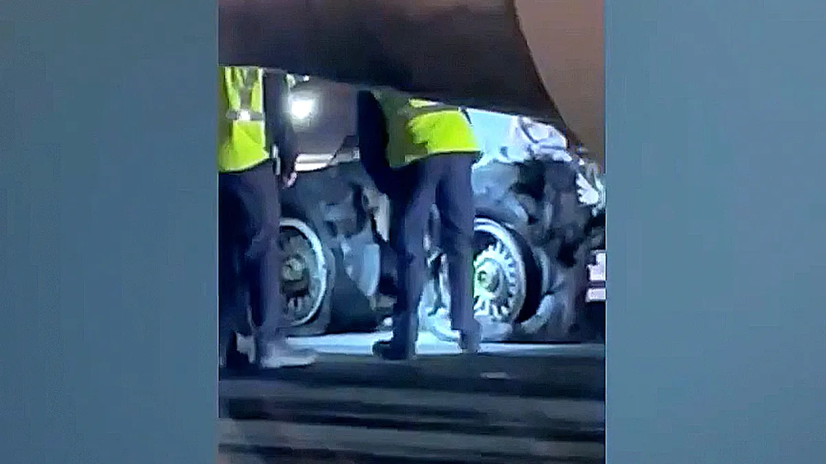 Uma visão aproximada mostra o trem de pouso danificado em um Boeing 767 da LATAM depois que a aeronave pousou em Lima, Peru, e sofreu uma falha no pouso no Aeroporto Internacional Hartsfield-Jackson de Atlanta em 7 de janeiro de 2026. (@yashodunn/Fox 5 Atlanta)