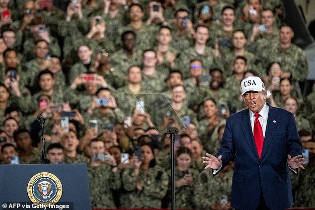 ‘Você vê que ninguém fabrica equipamentos como nós. Ninguém fabrica as munições, as armas, os mísseis, os aviões, nada disso”, disse Trump. ‘E se o fizerem, o marinheiro americano estará pronto para esmagá-los e afundá-los e destruí-los e jogá-los no esquecimento, certo?’