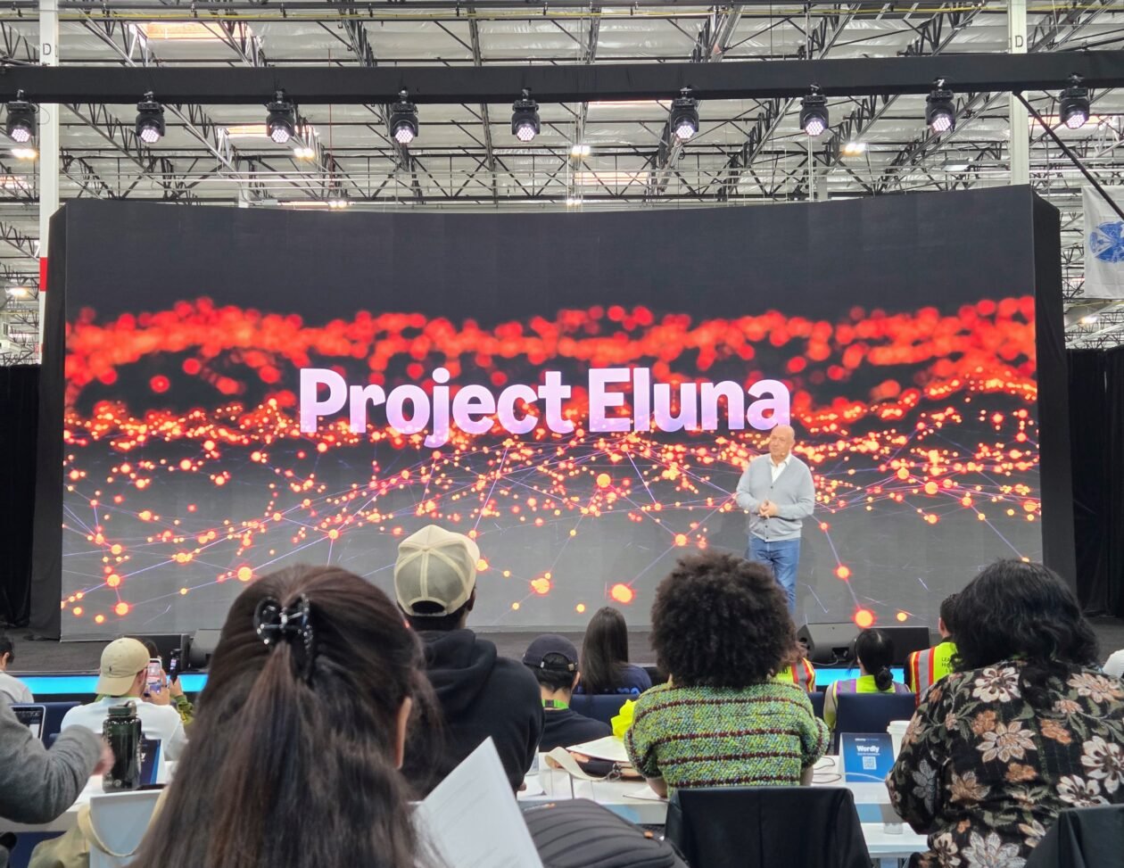 No palco do evento, Tye Brady, tecnólogo-chefe da Amazon Robotics, apresentou os mais novos sistemas da empresa — Blue Jay, uma configuração que coordena vários braços robóticos para coletar, guardar e consolidar itens; e o Projeto Eluna, um modelo de IA agente que atua como assistente digital para equipes de operações.
