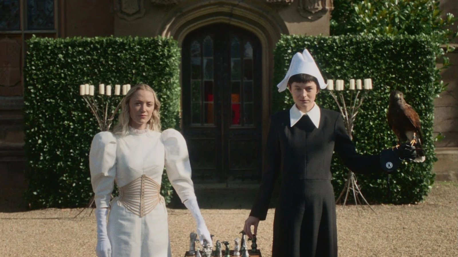 Corrin interpreta um herói excepcional, um contador de histórias de olhos brilhantes e destemido detector de besteiras. Observando as tentativas flagrantes de Manfred de seduzir Cherry imediatamente, Hero dispara insultos silenciosos com um olhar enquanto oferece a Cherry uma rota de fuga social: uma história continuamente contada sobre três irmãs. Retratado em sequências oníricas e iluminadas pelo gelo, Hero’s História das Pedras Dançantes é um fio dourado tecido em cada cena, enquanto Cherry aperta metaforicamente o botão de pânico sempre que Manfred se torna Demais. Na história, conhecemos três irmãs de cabelos negros (uma maravilhosa Charli xcx, Kerena Jagpal e Olivia D’Lima) que francamente merecem seu próprio filme. Elas foram “treinadas para o casamento” pelo pai, mas as irmãs compartilham um talento secreto, considerado “pecaminoso, perverso e proibido para as mulheres”. Cada vez que Corrin continua de onde paramos com a história, eu me acomodo ainda mais na minha cadeira, o talento do ator para contar histórias em plena exibição.