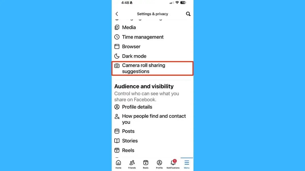 - Siga o mesmo caminho: Aplicativo do Fb → Configurações e privacidade → Configurações → Preferências → Sugestões de compartilhamento do rolo da câmera.