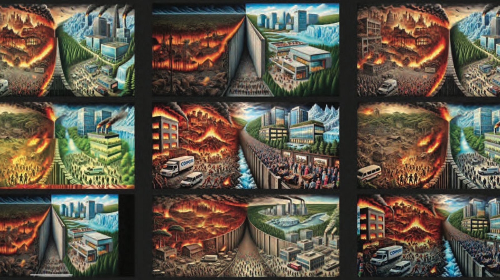 “Uma pintura distópica dividida em partes distintas que se misturam perfeitamente. Na extrema esquerda, há uma floresta em chamas. Ao lado, uma multidão de pessoas está fugindo do fogo, levando para o meio. No meio, centenas de milhares de pessoas em situação de pobreza estão tentando passe por um portão gigantesco com um grande cifrão. No outro lado do portão e toda a parede é um conglomerado de as pessoas mais ricas. Eles estão relaxando, vendo o mundo queimar para baixo e observando as pessoas lutando. Eles estão rindo, se divertindo e dançando. A cena é detalhada e impactante, destacando o forte contraste e a conexão direta entre as diferentes partes do mundo.”