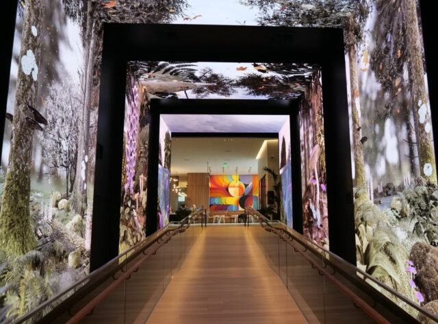 Mas talvez a característica mais marcante seja o portal interativo. Ao saírem das demonstrações, os visitantes caminham por um corredor digital envolvente com cenas da natureza nas paredes virtuais.