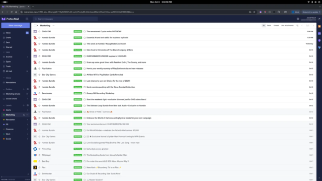 Além disso, o Proton identifica automaticamente essas listas de e-mail como “boletins informativos” e as coloca em sua própria visualização. Lá, você pode ver quantas mensagens eles enviaram, mover endereços para pastas diferentes e cancelar a assinatura. O Proton também mostra os serviços dos quais você já cancelou a assinatura. Depois de cancelar a inscrição em provavelmente 100 listas de e-mail, pelo menos meia dúzia de empresas ainda me enviavam e-mails. Consegui persegui-los e sair de suas listas de maneira adequada. (O Gmail também adicionou recentemente um sistema para gerenciar assinaturas.)