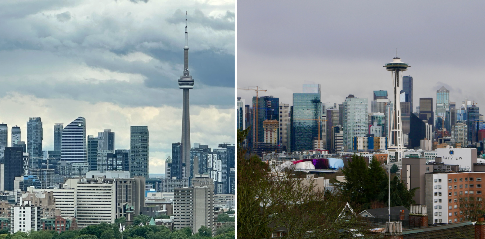 Tanto Toronto quanto Seattle têm marcos futuristas que definem seus horizontes: a CN Tower em Toronto (à esquerda) e o Area Needle em Seattle. (Fotos GeekWire)