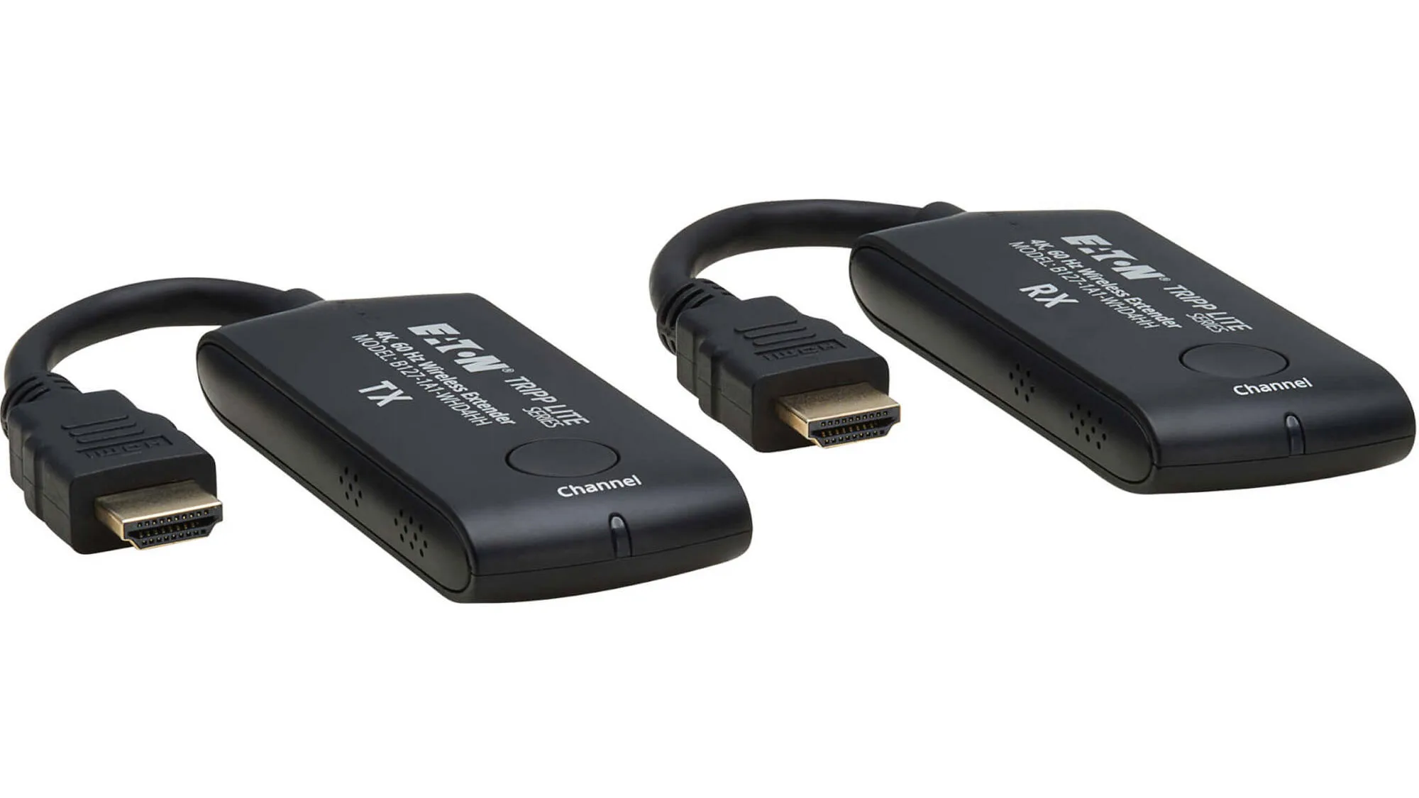 A opção que me parece melhor está disponível para pedido especial na B&H e em alguns outros lugares também. É o extensor sem fio Tripp Lite UHD 4K60 HDMI… e é classificado para enviar um sinal de até 65 pés usando uma banda wi-fi de cinco gigahertz, o que é realmente impressionante. Sem mencionar que é plug and play, sem a necessidade de software program para começar.